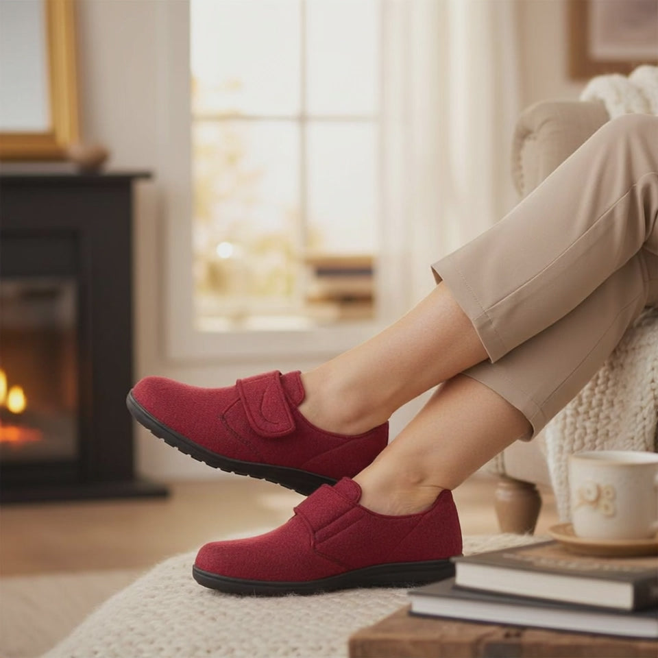 La doublure textile garantit un chaussant optimal et un maintien parfait du cou-de-pied et du talon d'Achille. Ce modèle est idéal pour les personnes souffrant d'un hallux valgus / rigidus, d'orteils marteaux, de déformations, etc. La partie avant étant en haute, la pantoufle offre beaucoup de place à votre votre pied. De plus, nous sommes sur une largeur K, donc très large.